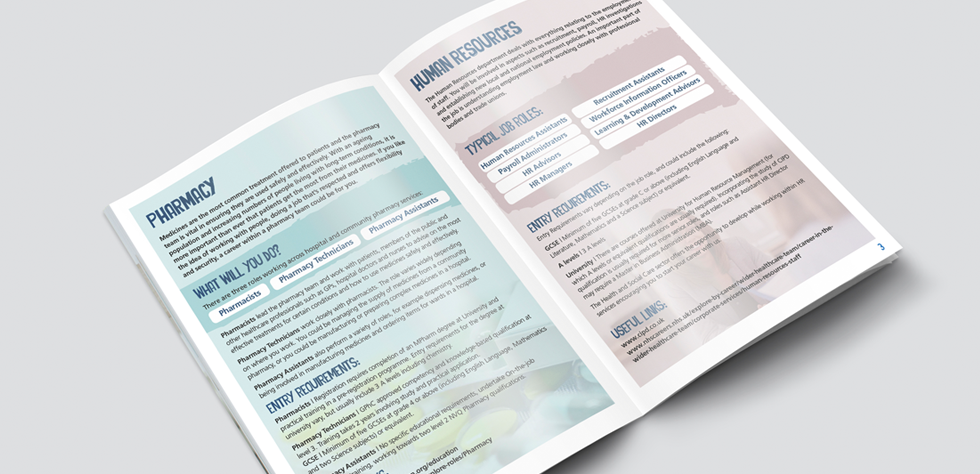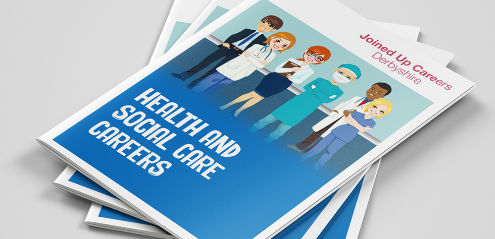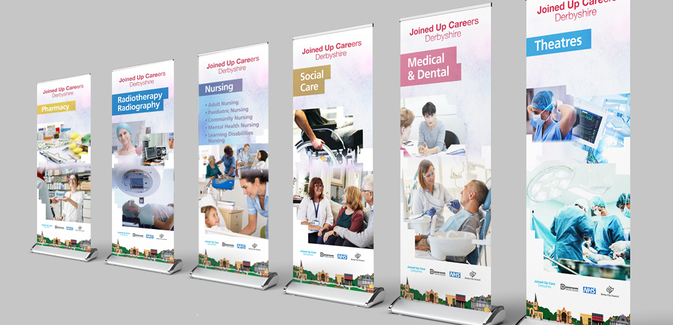 A colourful 30 page booklet was designed and produced by Diallog Creative. The booklet contains information on many of the areas within NHS with which people can work. Pop-up banners were also produced to use at careers fairs and also in schools and colleges in and around Derbyshire. Overall the materials help to inform and show the many opportunities in a vast array of areas for young people encouraging them to consider the NHS as a viable employer and in turn help combat the current staff shortages.
